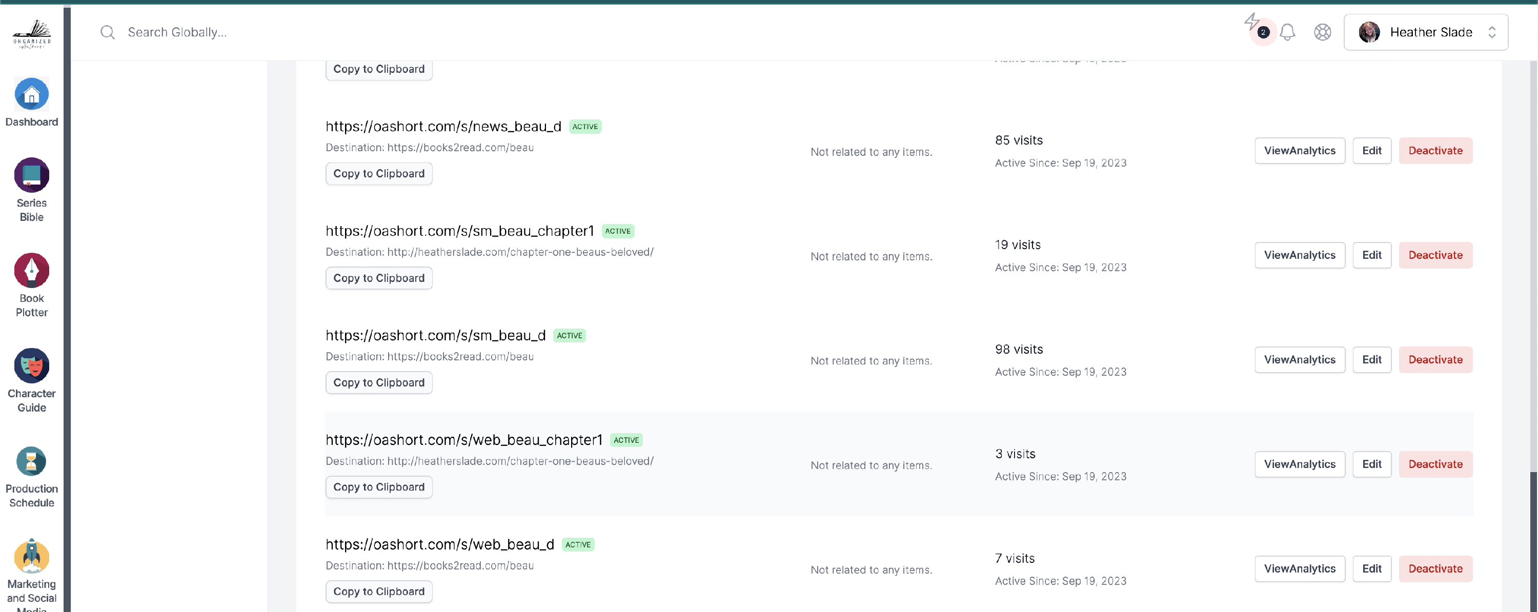 In the near future, we'll be rolling out full-scope analytics, allowing you to delve deeper into link conversion metrics. Additionally, you'll have the option to link your short links to a specific title in your catalog, providing an organized way to view all active short links for that title on your title page.